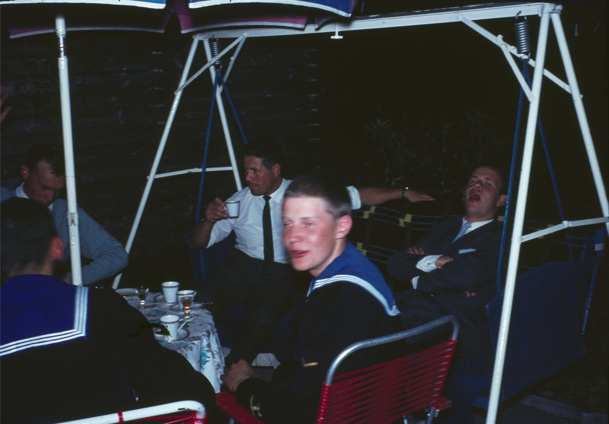 Bilden visar en grupp unga män dels i sjömanskostym dels i civila kläder som sitter runt ett bord och skämtar. Två at de sitter på en hammock.