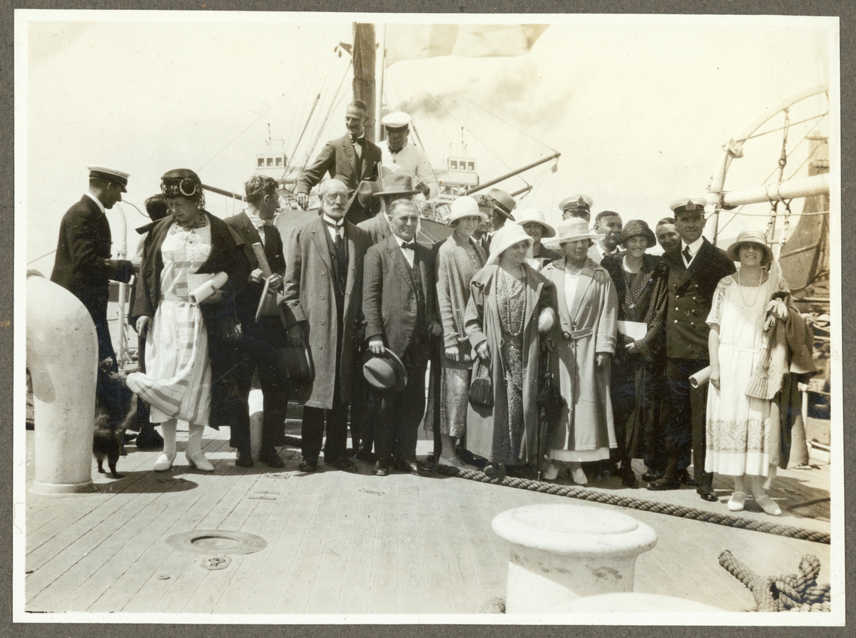 Bilden visar en grupp finklädda damer och herrar som betecknas som "kap-svenskarna" har samlats för en gruppfoto på Fylgia.
