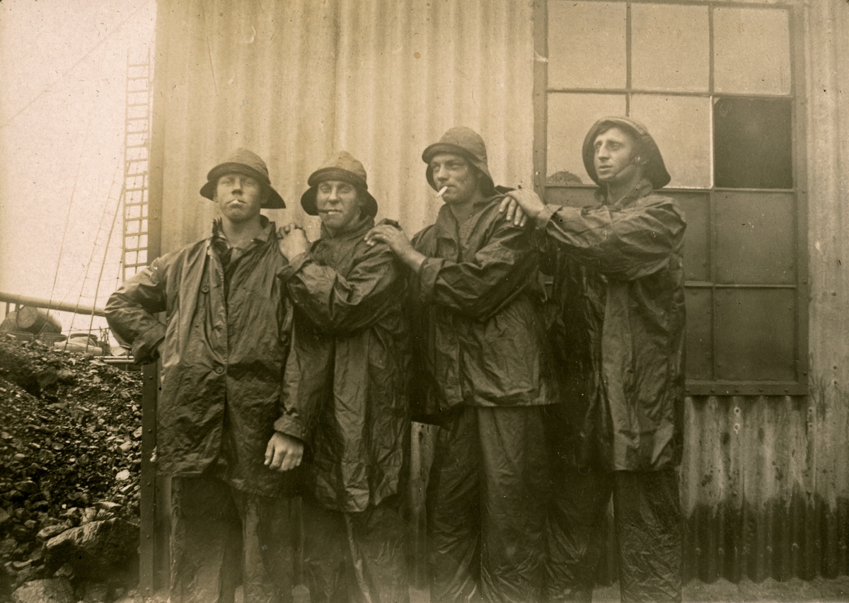 Poserande sjömän iklädda regnkläder. Gustaf Andersson längst till höger.