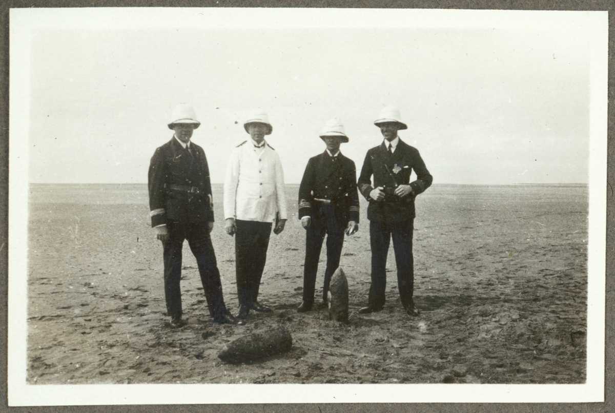 Bilden visar fyra befäl från Fylgia som bär uniform med tropikhjälmar och har samlats runt två stycken artilleriammunition på stranden av Pelican Point.