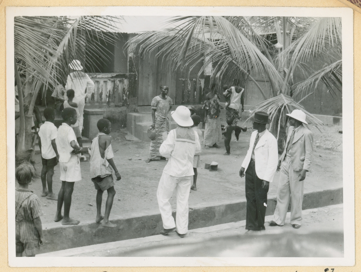 Bilden visar besättningsmän från kryssaren Gotland i sjömanskläder och tropikhjälm i samtal med barn och kvinnor i Sekondi-Takoradi.
