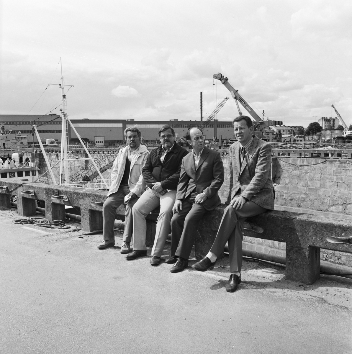 Detta grupporträtt visa fackföreningsordföranden i Karlskronavarvet 1982. De fyra personer som sitter framför en torrdocka på varvet är från vänster: Bernt Johansson, SF, Jan-Åke Andrén, SALF, Arne Lifgren, SIF, och Karl-Gustaf Levander, CF. Skyddstjänsten anser sittplatsen på dockans hammarband olämplig.