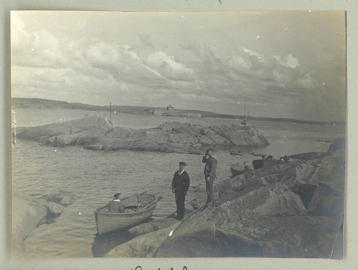 På bilden syns flera sjömän och roddbåtar som har stigit i land på Hunneskär i Göteborgs skärgård. I bakgrunden ligger Nya Älvsborgs fästning.