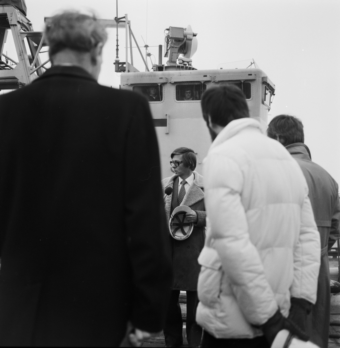 Bilden visar utrikesminister Ola Ullsten under ett besök på örlogsbasen Karlskrona. I bakgrunden syns torpedbåten Varberg.