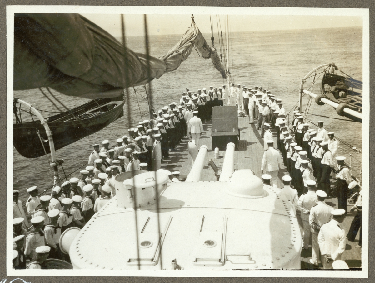 Bilden visar besättningen på pansarkryssaren Fylgia som har tagit uppställning på akterdäcket.