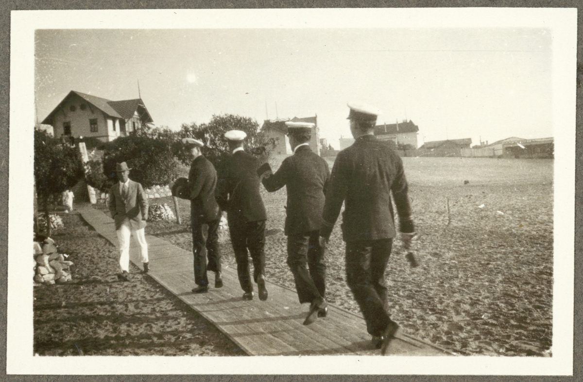 Bilden visar fyra befäl från Fylgia som går på en plankväg vid stranden av Swakopmund.