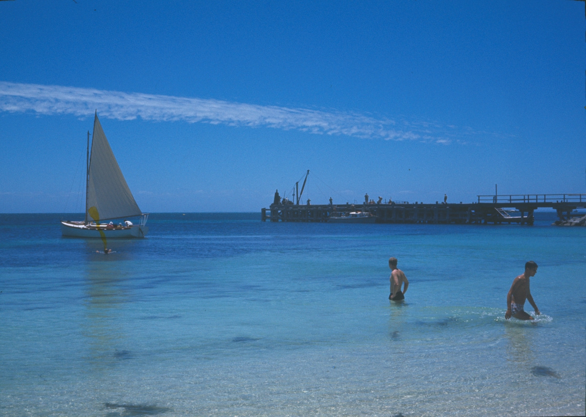 Bilden visar badgäster vid en strand i Freemantle. I viken ligger en segelbåt och i bakgrunden syns en brygga.