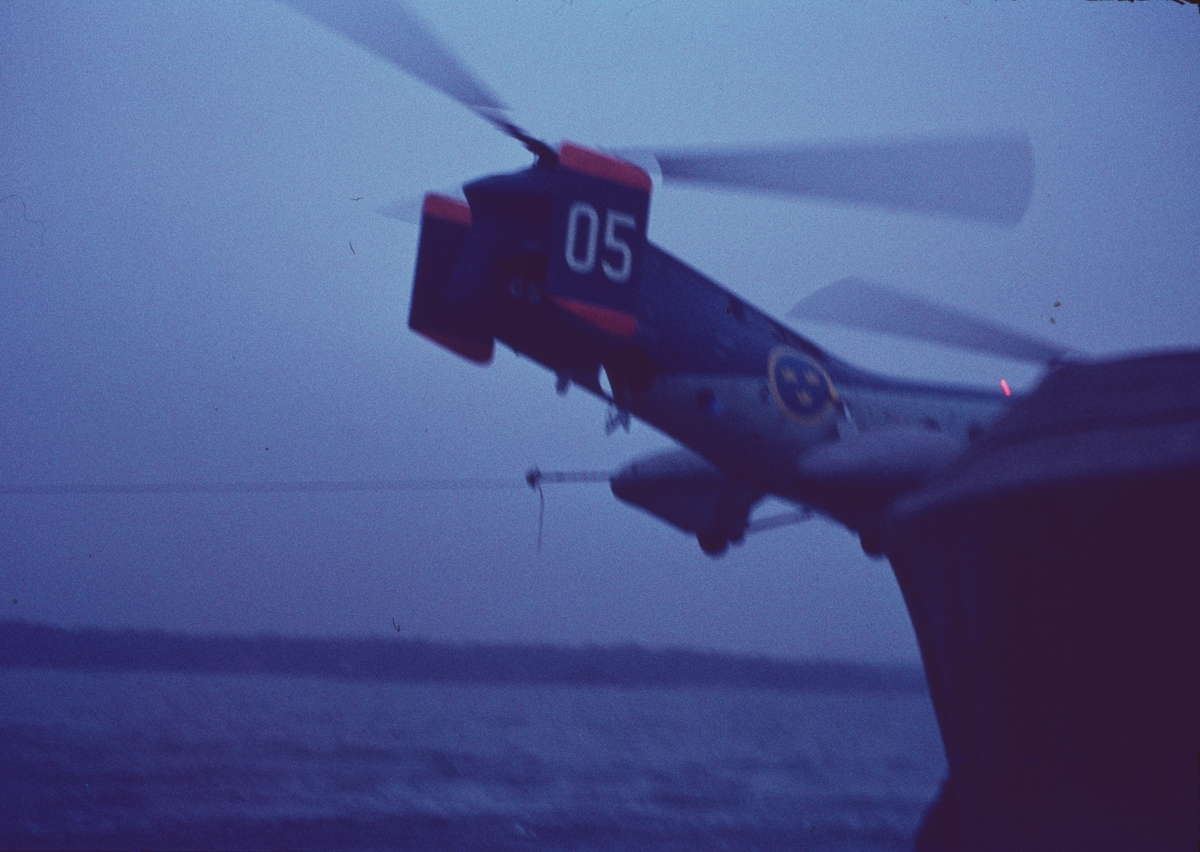 Bilden föreställer en så kallad flygande banan - en helikopter typ Vertol 44 med nummer 05 på häckfenan under flygning.