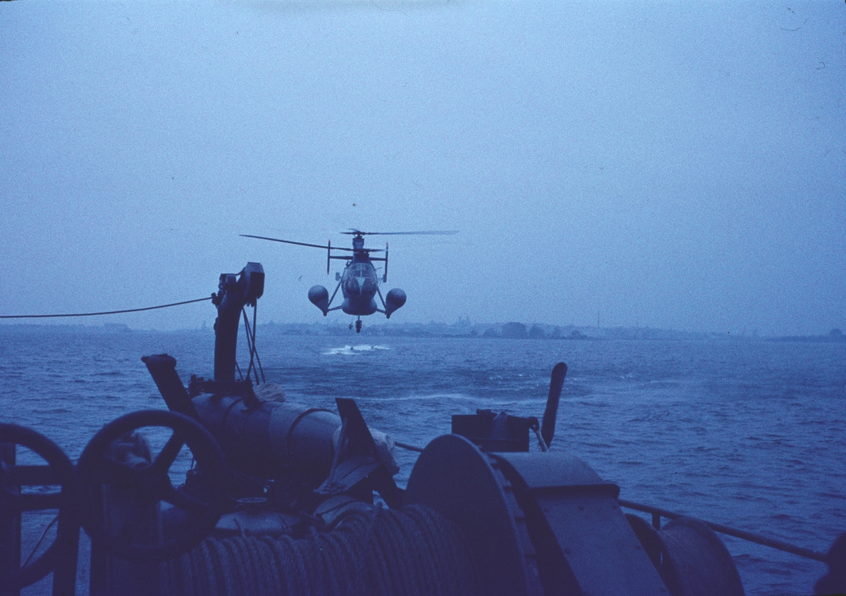 Bilden föreställer en så kallad flygande banan - en helikopter typ Vertol 44 under flygning. I förgrunden ser man akterdäcket av en minsvepare. I bakgrunden anar man siluetten av Karlskrona.