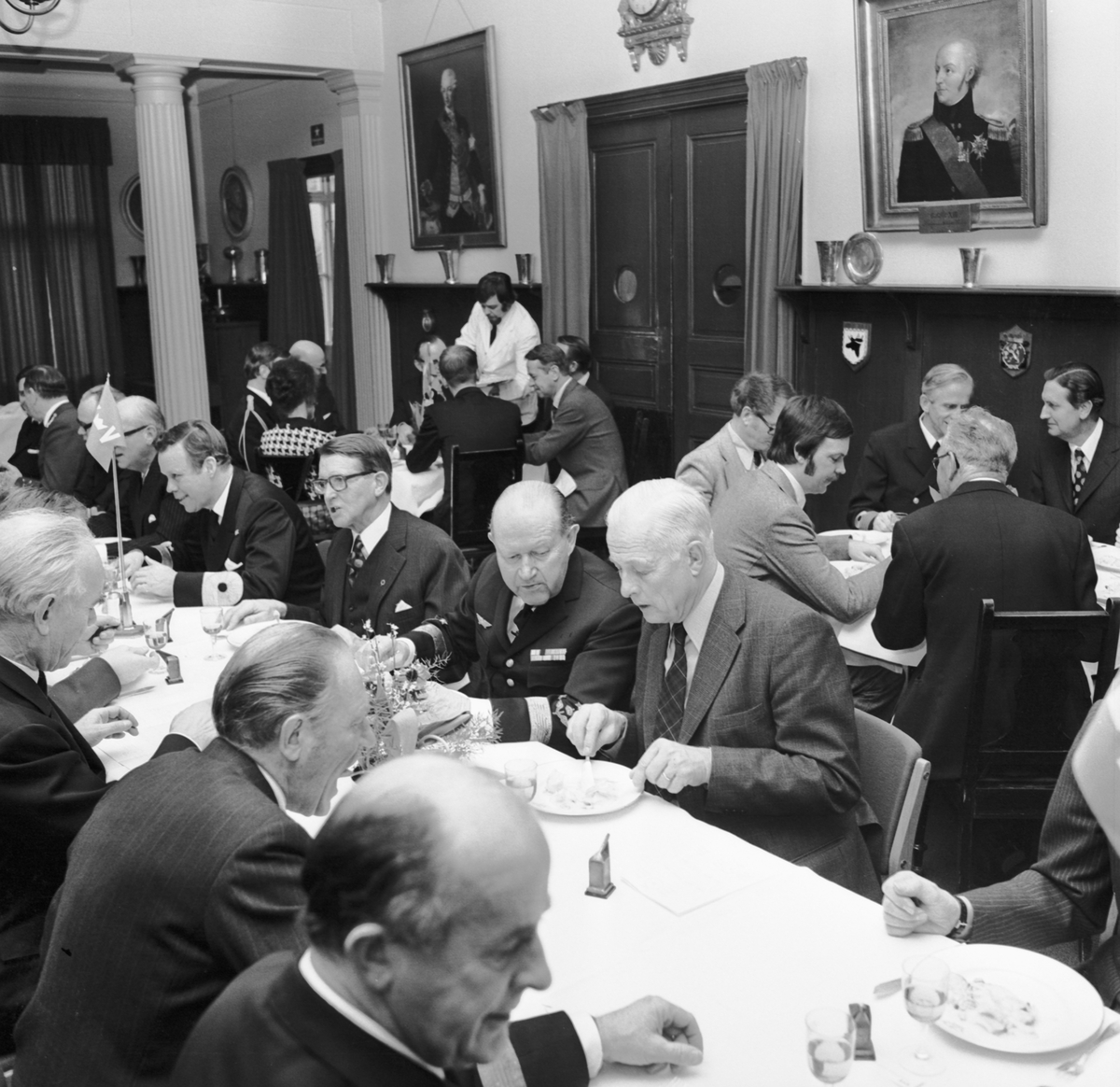Bilden visar personal från Marinen och Karlskronavarvet som äter middag efter sjösättningen av T-137 Umeå. I Imitten sitter general Torsten Rapp, till vänster i samma rad syns konteramiral Rolf Rheborg. Närmast kameran syns marinchefen, viceamiral Bengt Lundvall och till vänster om honom är Karlskronavarvets VD Johan Söderman.
