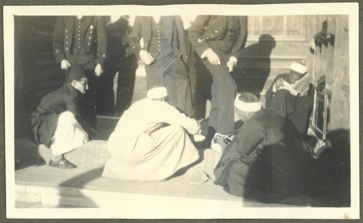 Denna bild är svårt att tolka. Den kan vara skoputs eller en rituell tvättning av fötterna inför ett moskébesök.