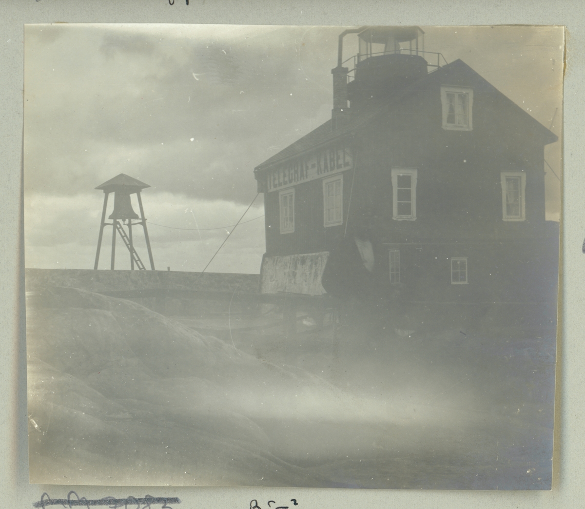 Bilden visar typisk gammal fyrplats där ett liten fyrtorn är inbyggt i en stuga. Bredvid huset står en liten klockstapel med klocka.