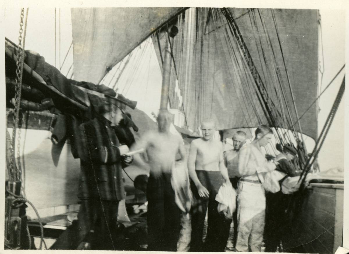 Ombord på Gladan en morgon under segel. Manskapet tvättar sig