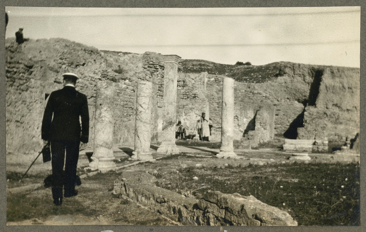 Bilden visar en sjöman från Fylgia som promenerar genom Pompeijs ruiner. I bildens centrum syns två konstnärer som har byggd upp sina stafflier.