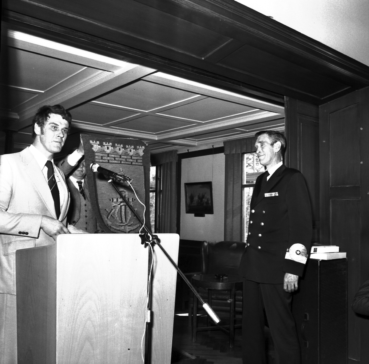 Bilder tagna vid sjösättningsmiddagen i samband med sjösättningen av minfartyget Carlskrona. En man klädd i kostym står bakom ett podium med en mikrofon framför. Bakom honom står ytterligare en man som håller upp en väv. Vid sidan av männen står viceamiral Rudberg klädd i uniform.
