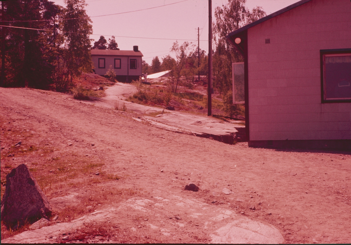 På bilden syns en gata med byggnader och landskap på Gålö.