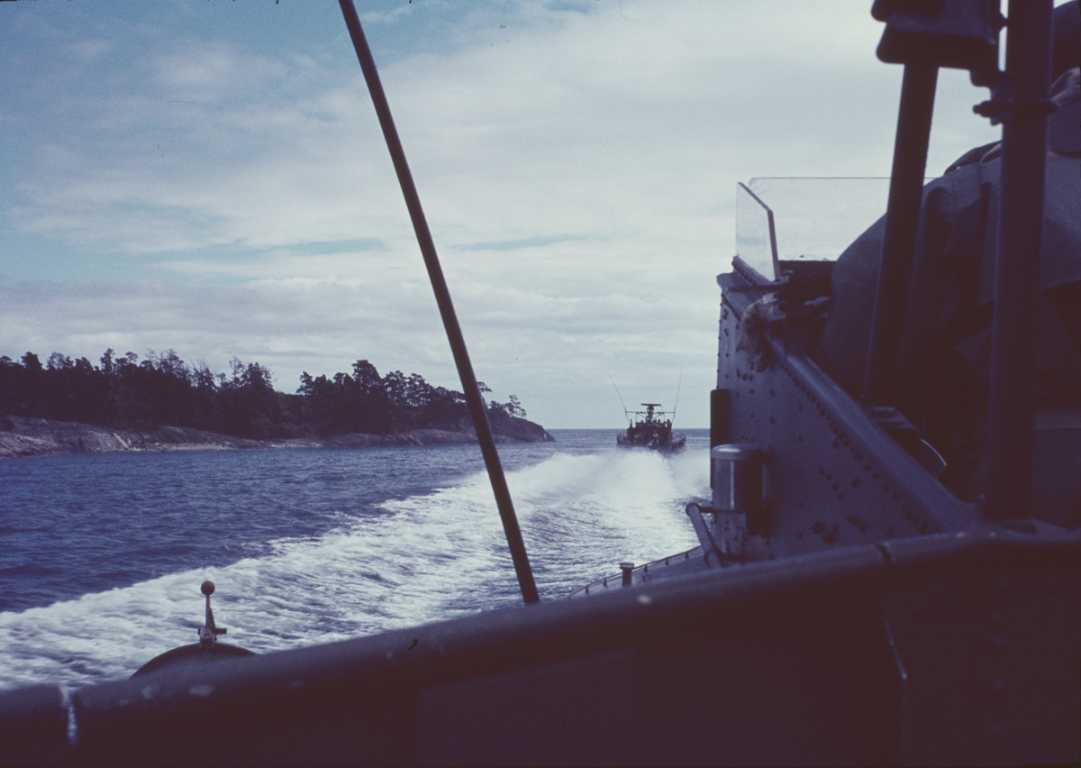 Bilden visar motortorpedbåtar som passerar Järnholmssund i Stockholms skärgård.
