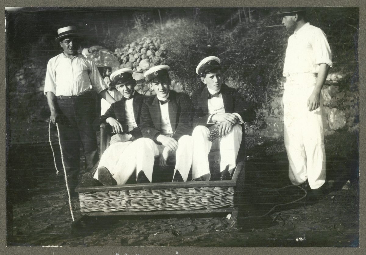 Bilden visar tre sjömän på Madeira som sitter i en märklig sittmöbel med rep på båda sidor som hålls fast två män.