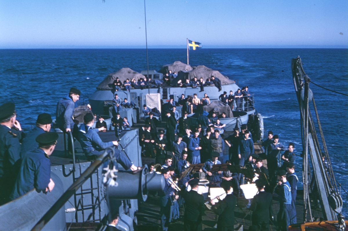 Titel: Besättning ombord på kryssaren Gotland.