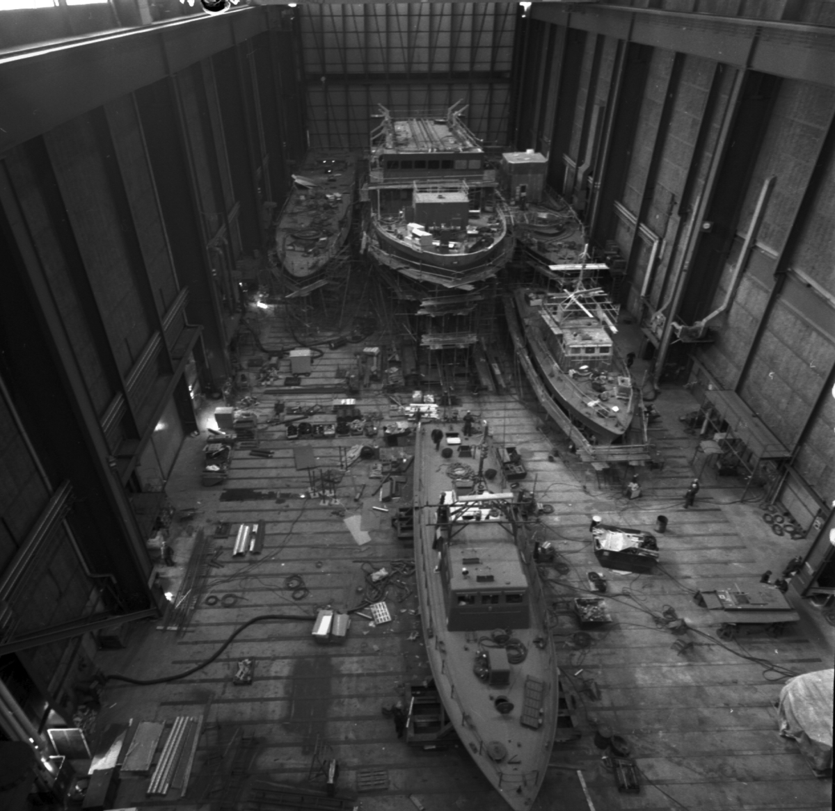 Översiktsbild med bl.a. Spica III och bevakningsbåt i skrovhallen\\\\anm. neg ingår i en seri om 4 st varav endast det första scannats/gp