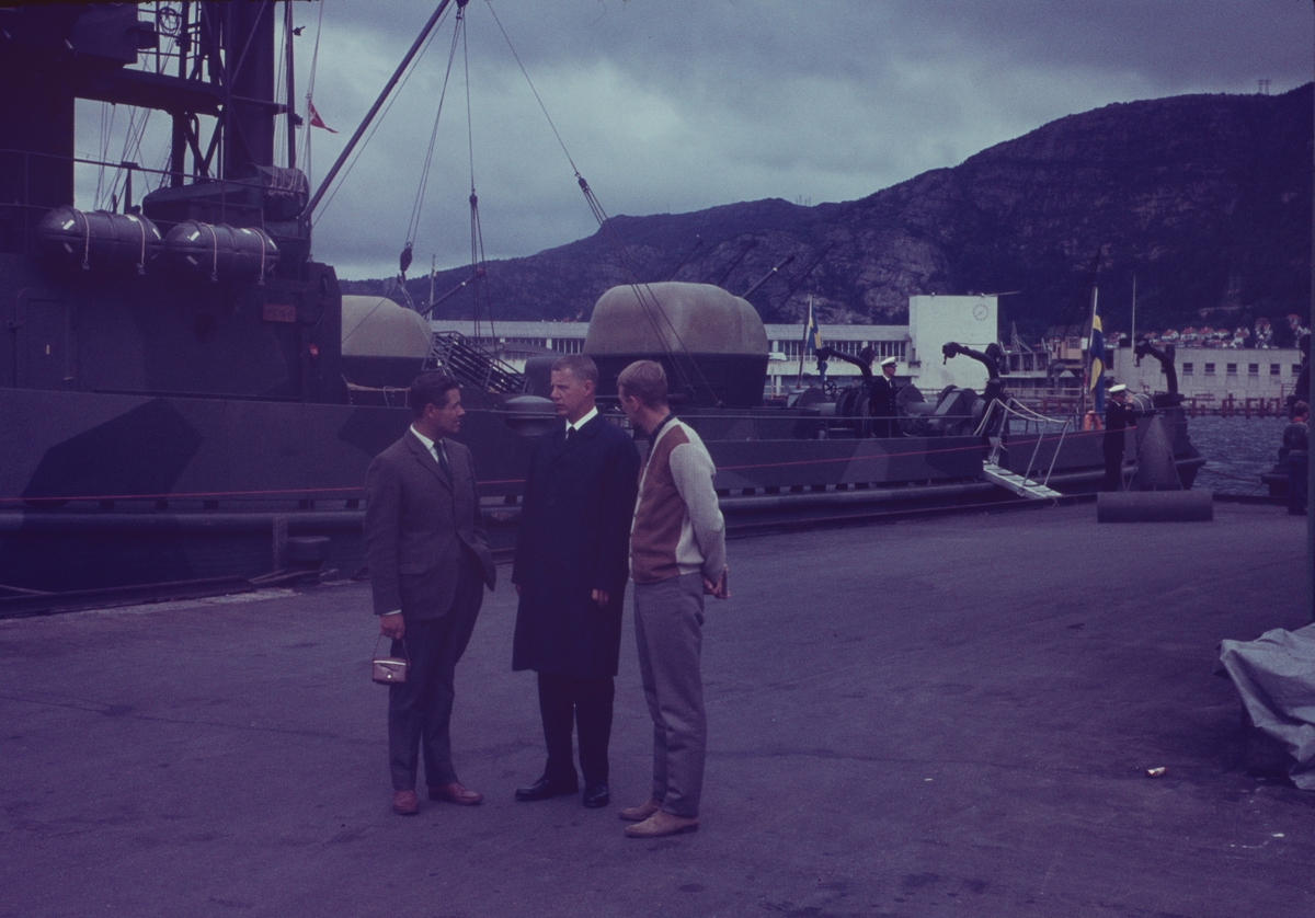 Bilden visar tre män i civila kläder i ett samtal. De står på en kaj med minsveparen Tärnö i bakgrunden.