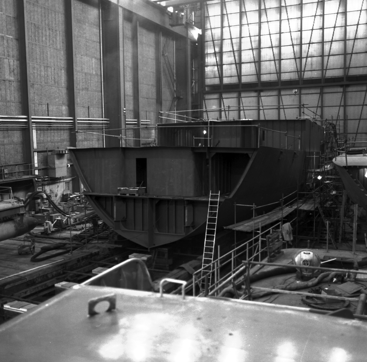 Spica III och bevakningsfartyget under byggnad i skrovhallen, samt vedettbåtar