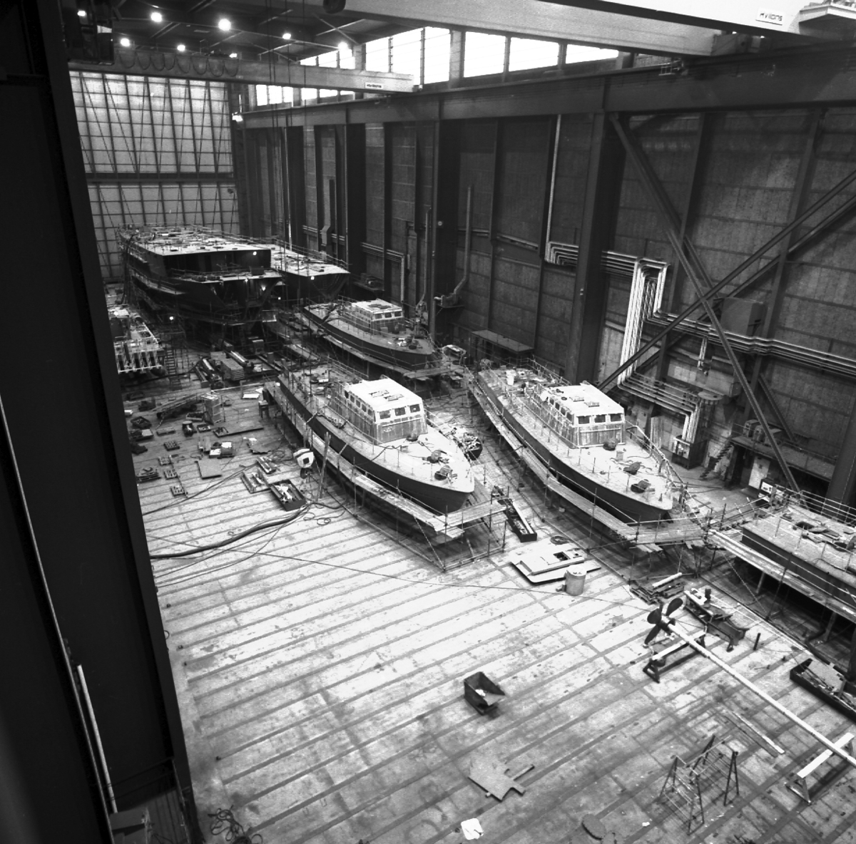 Spica III och bevakningsfartyget under byggnad i skrovhallen, samt vedettbåtar