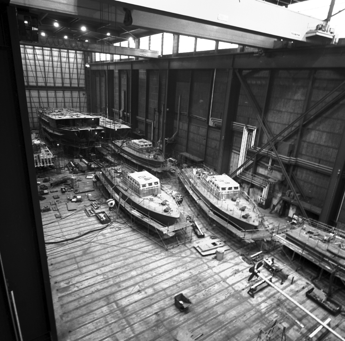 Titel: Spica III Spica III och bevakningsfartyget under byggnad i skrovhallen, samt vedettbåtar