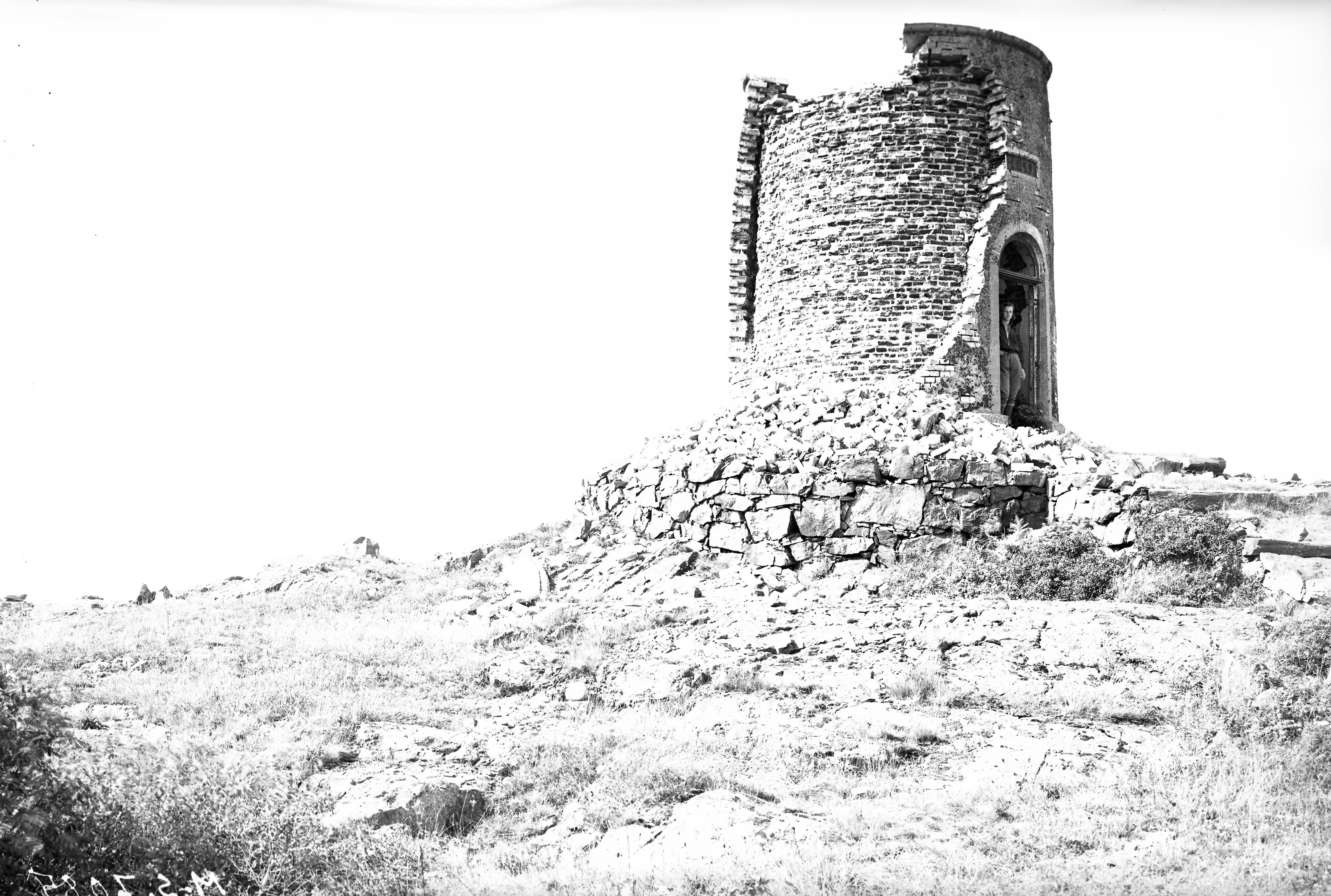De övergivna fyrarna. Person / kvinna i dörröppning. Fyrarna tändes 1849, men släcktes redan 1891 på grund av att de var för högt placerade. Tjärnö 86:1.
