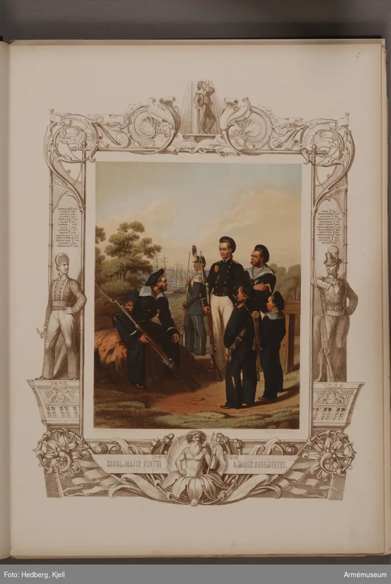 Plansch med uniform för Flottan och Marinregementet. Plansch i färgtryck efter original av Julius Mankell 1864. Ingår i planschsamlingen Anteckningar rörande svenska regementers historia.