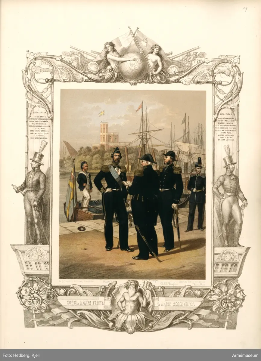 Plansch med uniform för Flottan och Marinregementet. Plansch i färgtryck efter original av Julius Mankell 1864. Ingår i planschsamlingen Anteckningar rörande svenska regementers historia.