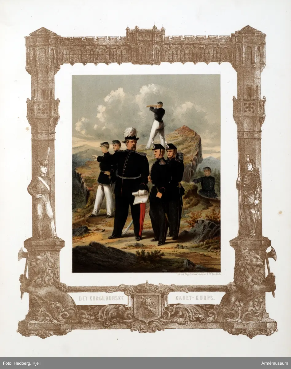 Plansch med uniform för kungliga norska kadettkåren. Plansch i färgtryck efter original av Julius Mankell 1864. Ingår i planschsamling med norska arméns uniformer.