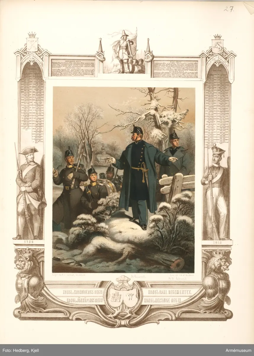Plansch med uniform för Kronobergs, Jönköpings, Dalarnas och Hälsinge regementen. Plansch i färgtryck efter original av Julius Mankell 1864. Ingår i planschsamlingen Anteckningar rörande svenska regementers historia.