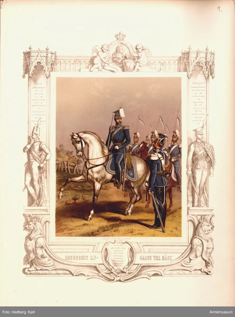Plansch med uniform för Livgardet till häst. Plansch i färgtryck efter original av Julius Mankell 1864. Ingår i planschsamlingen Anteckningar rörande svenska regementers historia.