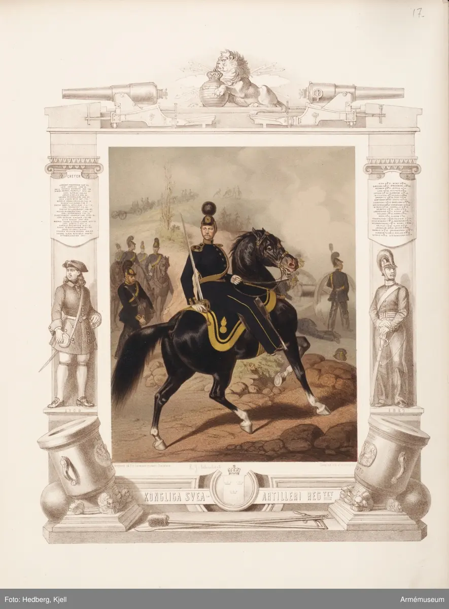 Plansch med uniform för Svea artilleriregemente. Plansch i färgtryck efter original av Julius Mankell 1864. Ingår i planschsamlingen Anteckningar rörande svenska regementers historia.
