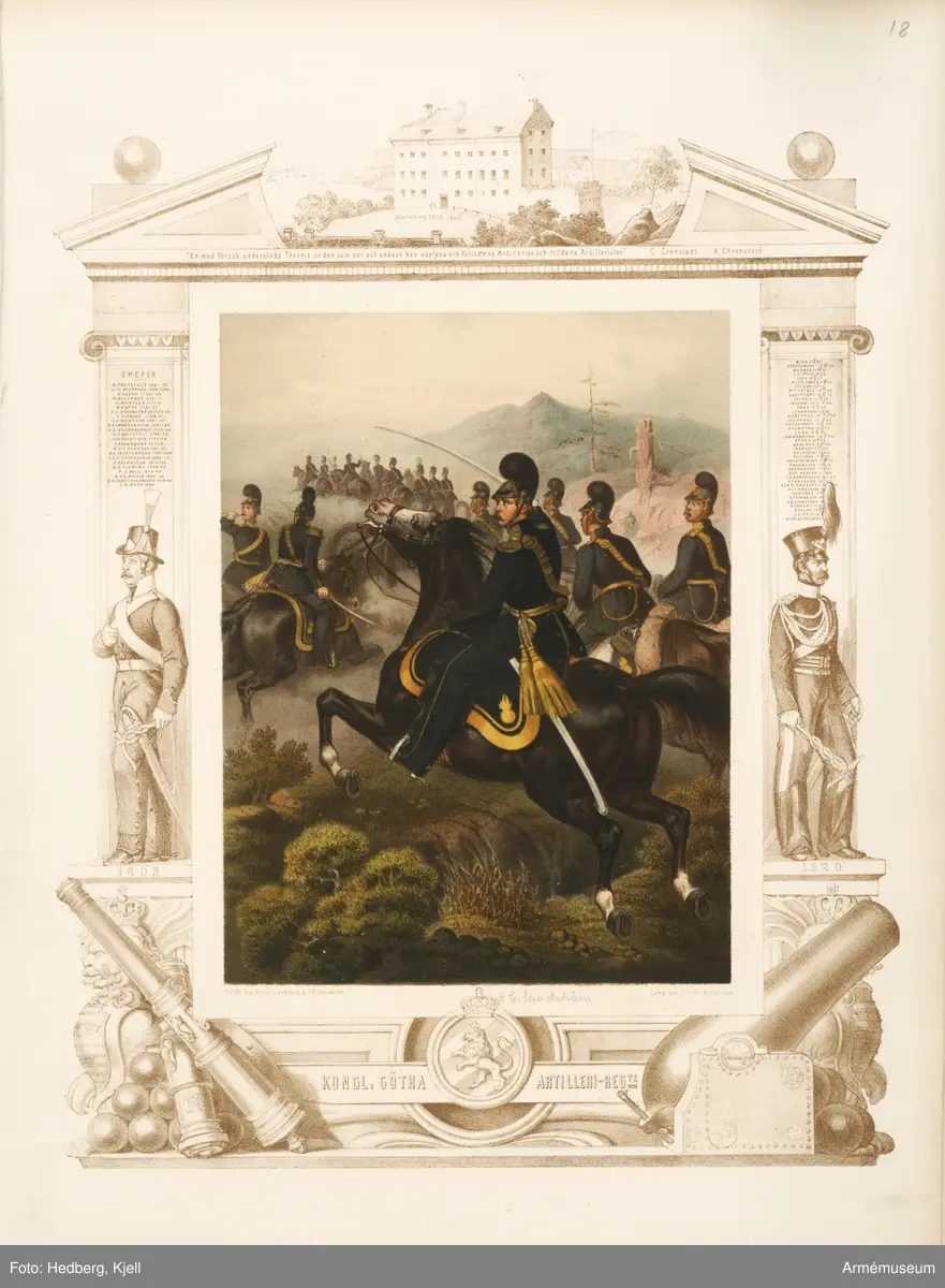 Plansch med uniform för Göta artilleriregemente. Plansch i färgtryck efter original av Julius Mankell 1864. Ingår i planschsamlingen Anteckningar rörande svenska regementers historia.
