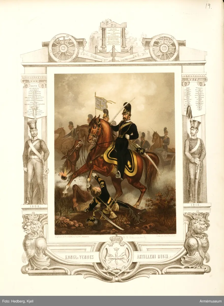 Plansch med uniform för Wendes artilleriregemente. Plansch i färgtryck efter original av Julius Mankell 1864. Ingår i planschsamlingen Anteckningar rörande svenska regementers historia.