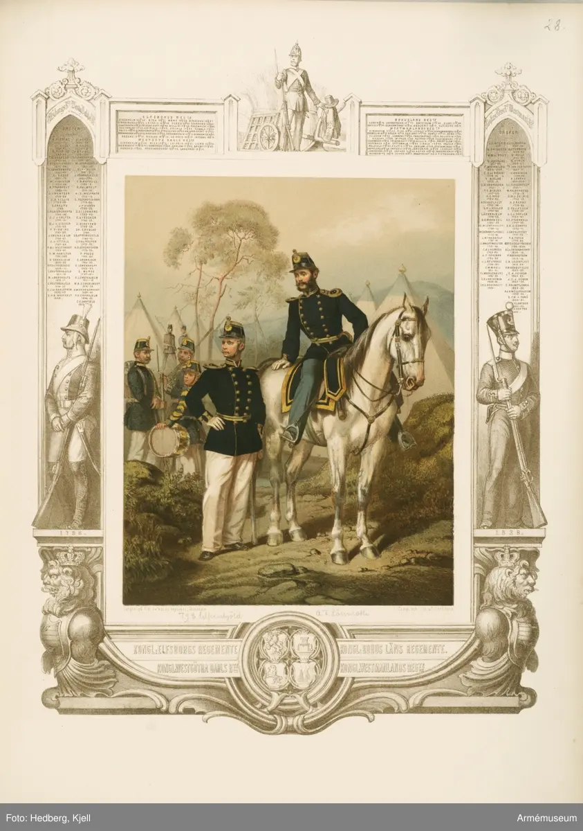 Plansch med uniform för Älvsborgs, Västgöta-Dals, Bohusläns och Västmanlands regementen. Plansch i färgtryck efter original av Julius Mankell 1864. Ingår i planschsamlingen Anteckningar rörande svenska regementers historia.