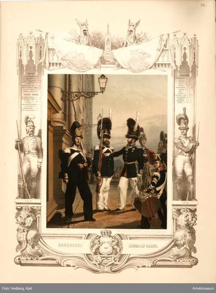 Plansch med uniform för Andra livgardet. Plansch i färgtryck efter original av Julius Mankell 1864. Ingår i planschsamlingen Anteckningar rörande svenska regementers historia.
