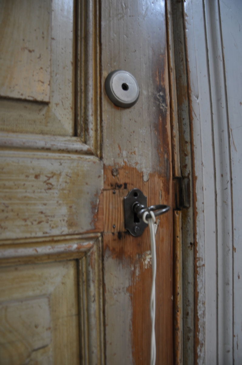 Interiör från förstugan i parstugan på Nygårdsgården i Bingsjö. Byggnaden stod ursprungligen på annan plats i byn men flyttades omkring 18601861 till nuvarande plats som då var åkermark. Bakom denna dörr fanns under en tid byns postkontor varför ett extra lås behövdes.