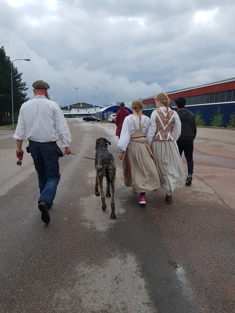 Buffring till Arvselen, Malung, 2018. Här går vähen förbi Malungs ishall. I bild syns Täpp Lars Arnesson, dräktklädda Täpp Kerstin Arnesson, Rebecca Antonsson och hunden Karo.