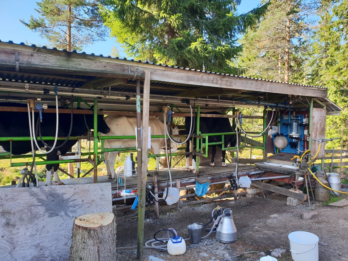 Korna mjölkas med mjölkmaskin, Nysjöns fäbodar, Svärdsjö, Falun, 2018.