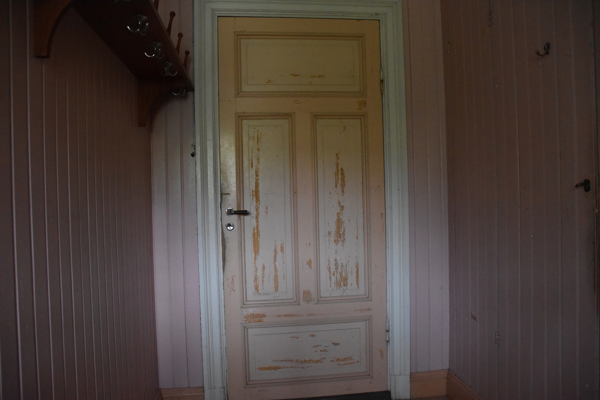 Interiör från korsplanshuset på Nygårdsgården i Bingsjö. Hallen på bottenvåningen med tillhörande trappor till källare och övervåning. Huset uppfördes 1912.