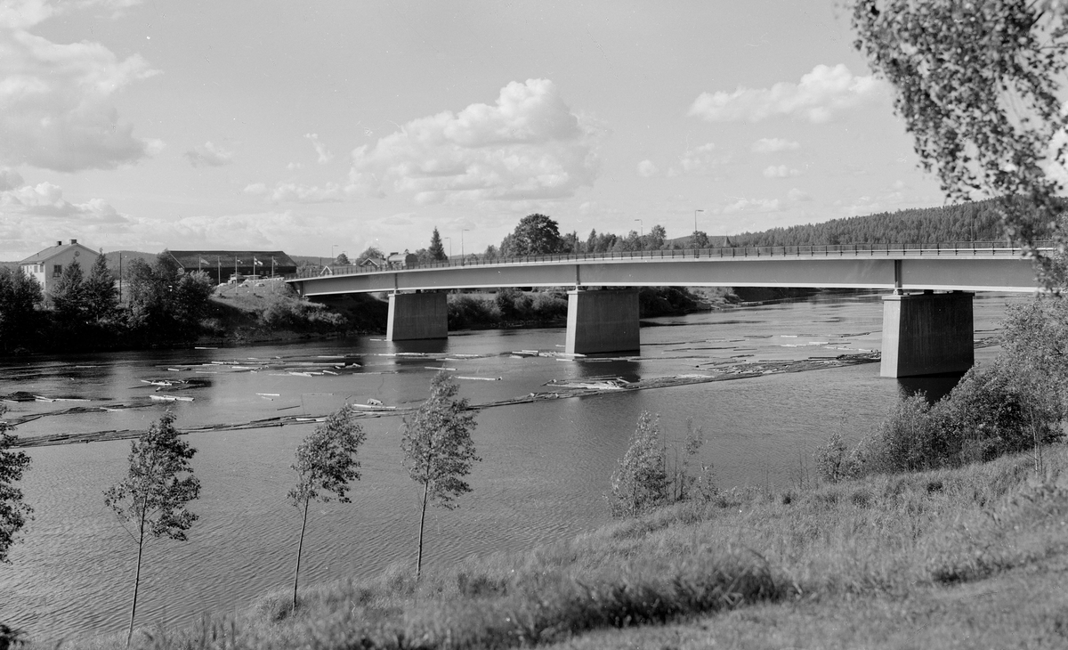 Uppbo. Bron över Dalälven. Huset till vänster har ljus fasad och rött tak. Den mörka byggnaden är rött.