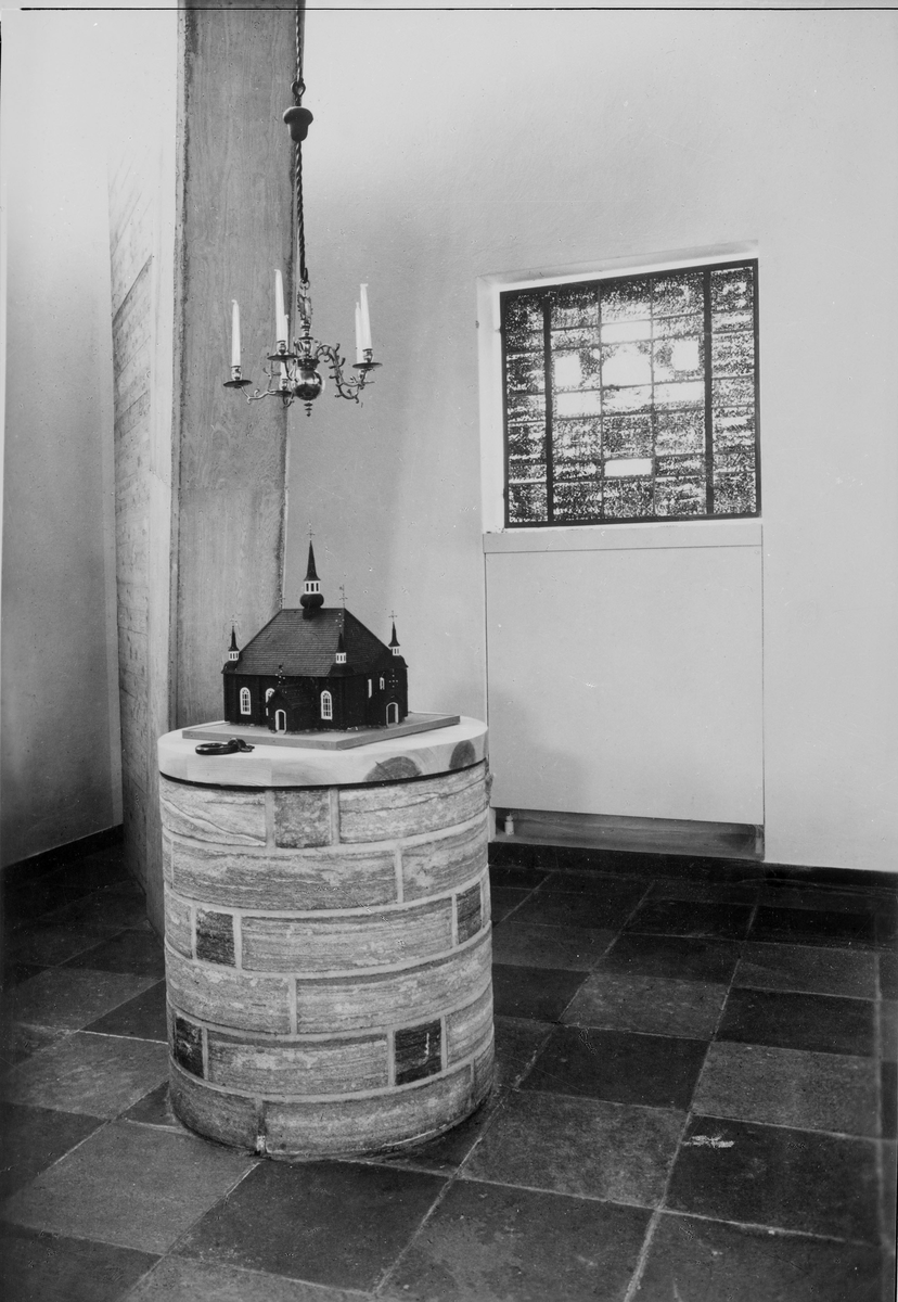 Falun, Aspeboda kyrka. Dopfunt med modell av gamla kyrkan 1967.