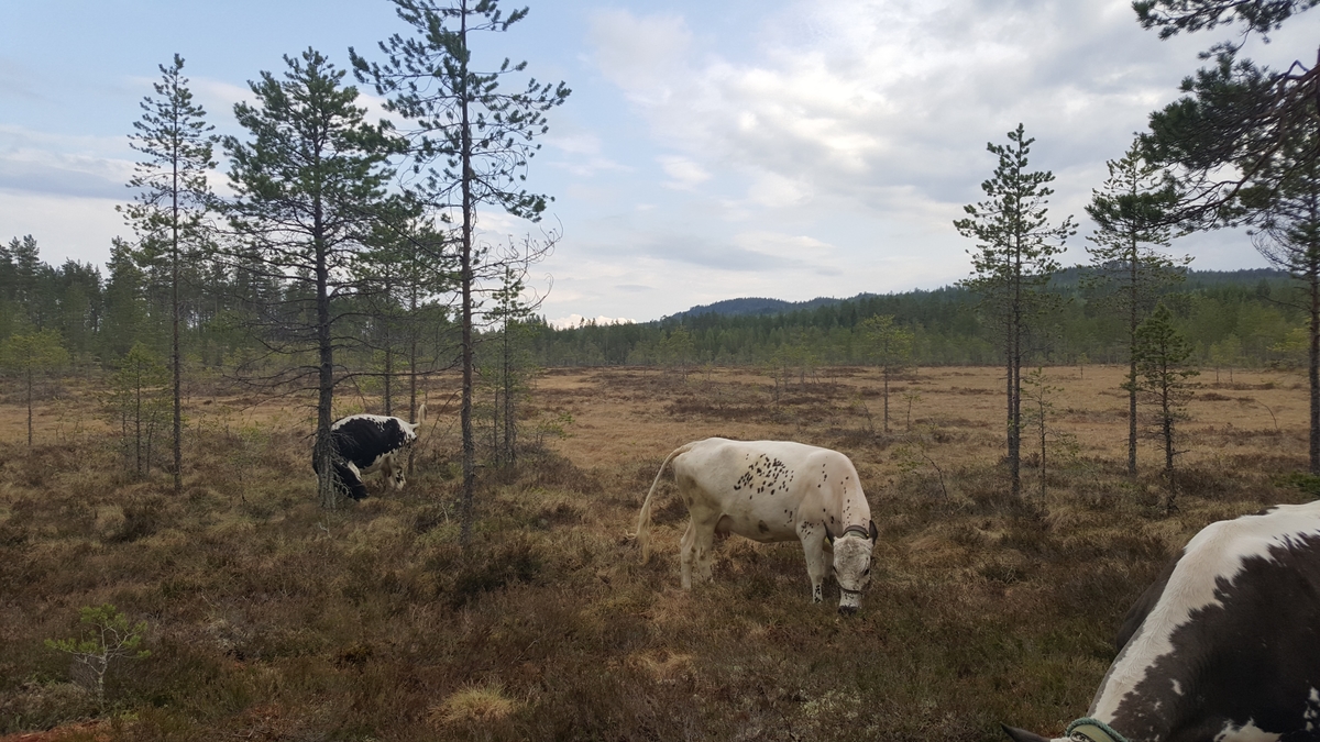 Fjällkor betar i markerna kring Jägra by dagen innan buffring till Arvselens fäbod, Malung, 2018.
