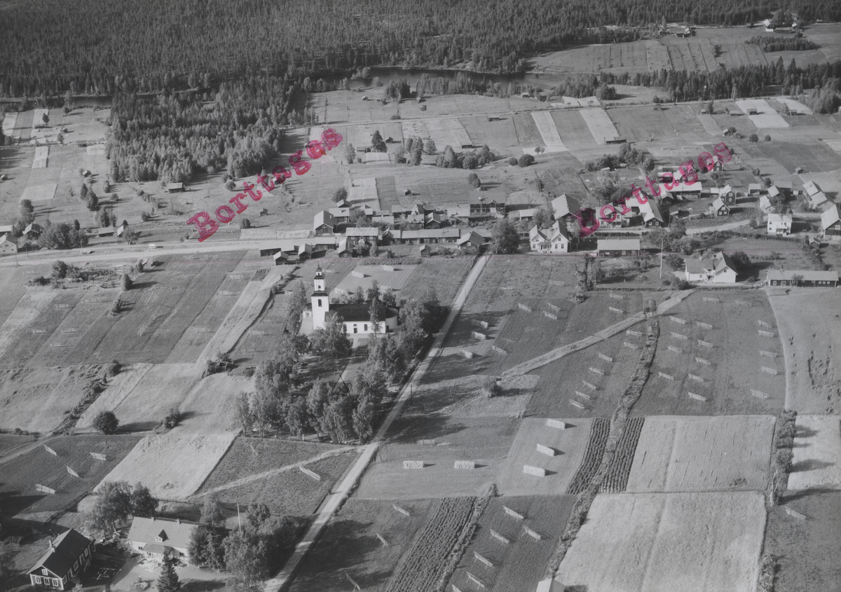 Flygfoto över Skattungbyn. Skattungbyn och Skattunge kyrka, Orsa kommun, år 1950.