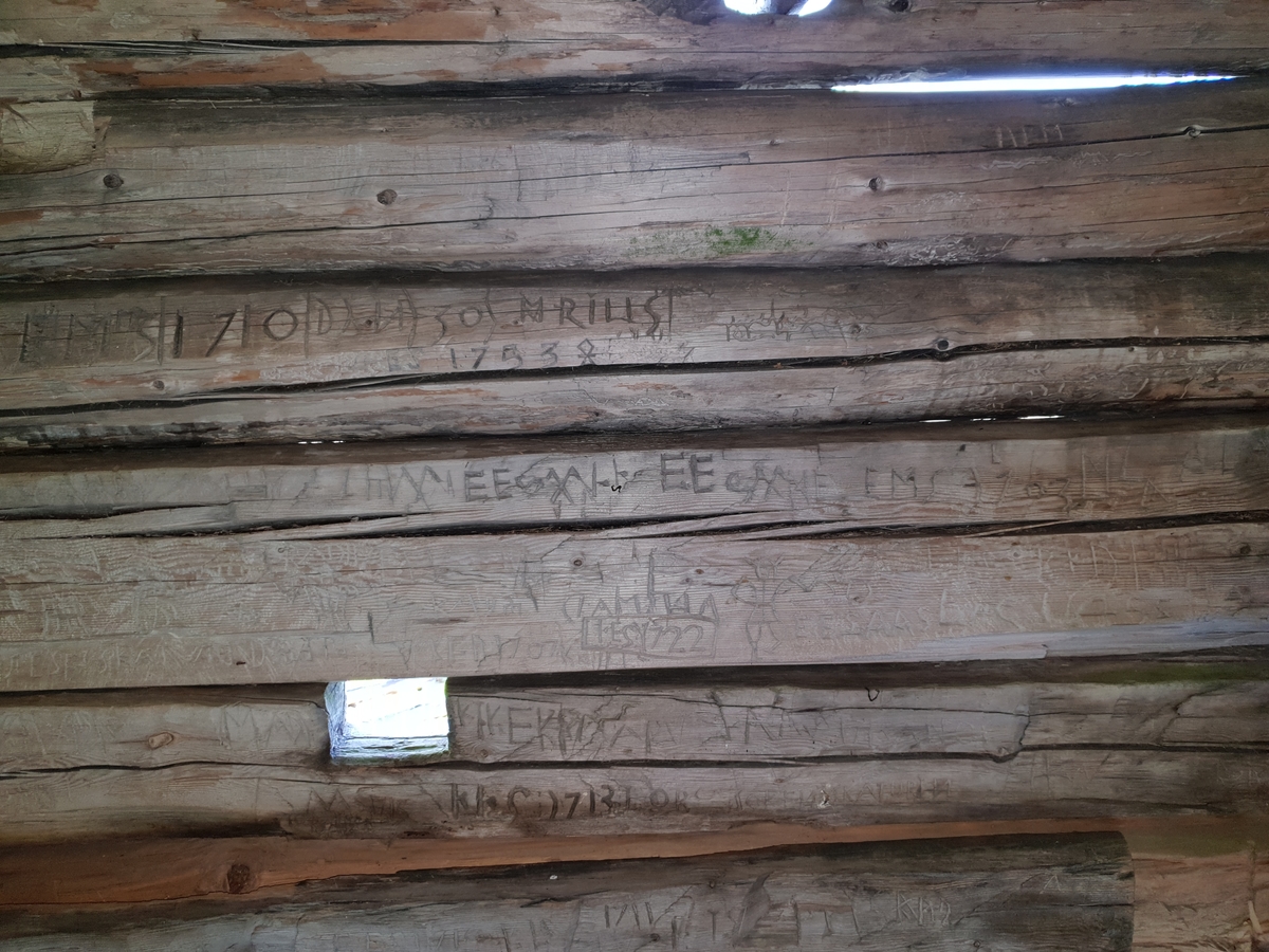 Timmervägg, ristningar inomhus, Ärteråsen, Ore, 2018.