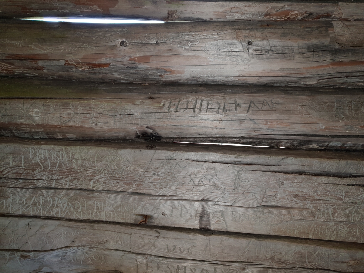 Timmervägg, ristningar inomhus, Ärteråsen, Ore, 2018.