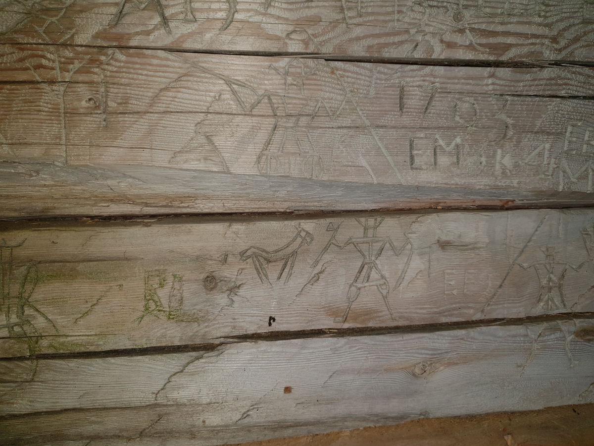 Timmervägg, ristningar inomhus, Ärteråsen, Ore, 2018.
